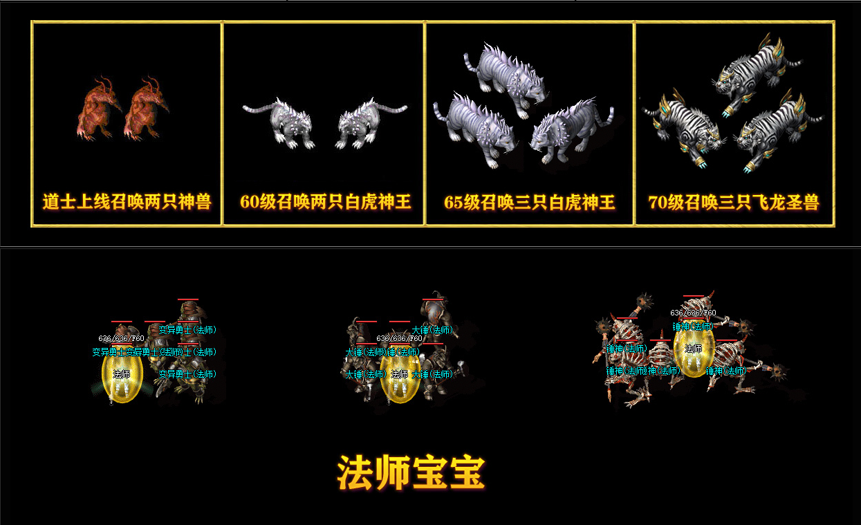 ★50级2只5级虎王55级召3只7级虎王,60级三只虎王,65级三只虎圣,70级3只8级超级虎王(散人玩家首选道士)【站撸各大BOSS】★